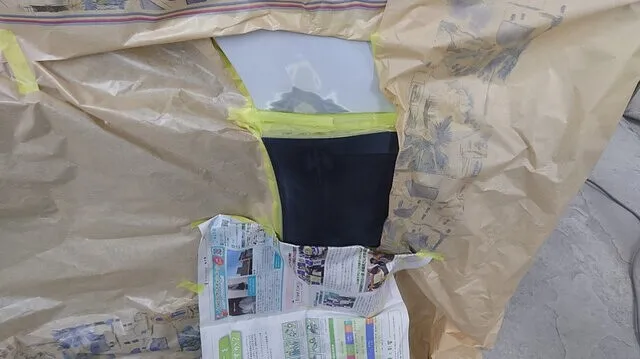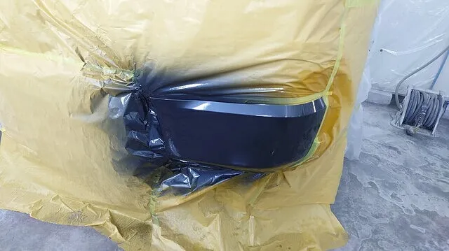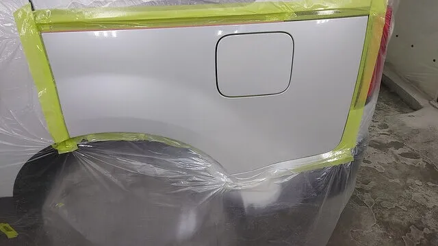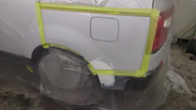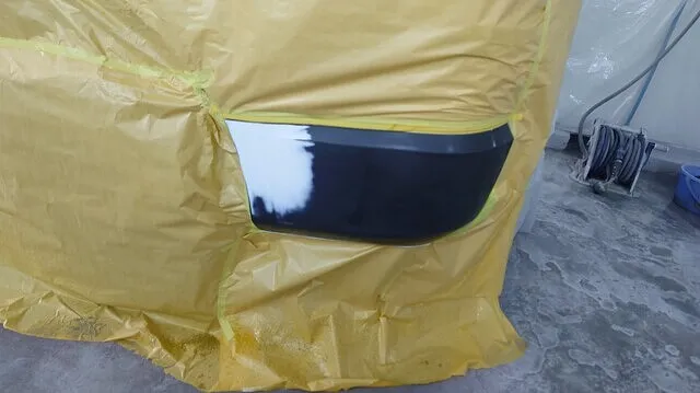 塗装専用ブースにてマスキング処理を行い塗装を行います。今回のデリカD5のホワイトパールは比較的新しい塗色でデータがあまりありませんでしたが調色カメラと人の目にてしっかりと調色しグラデーション塗装を行い綺麗に仕上げる事が出来ました。もちろん養生のビニールはボディ全体にかぶせて余計な所に塗装ミストがかからない様に万全に対策しております。