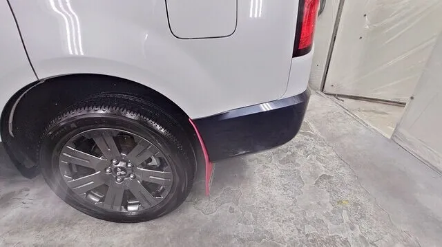 お客様が細い道での通り抜けでうっかりと左のサイド部(リヤフェンダー)をこすってしまったそうです。今回お問い合わせ頂いたのち直接ご来店頂きお車の確認をさせて頂きました。画像では分かりにくいですが白部分のリヤフェンダーも凹み傷が入ってしまっています。下のバンパー部は見た通り傷が入ってしまっています。あと赤のマッドガードも端部が少し削れている状態です。今回お客様とお話し修理方法をいくつかご提案させて頂きました所今回はすべて修理でさせて頂きマッドガードはそのまま再使用すると言った流れで作業させて頂くこととなりました。では早速掛かって行きたいと思います。