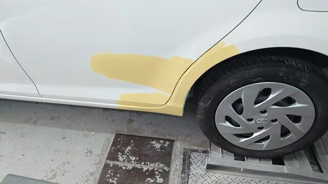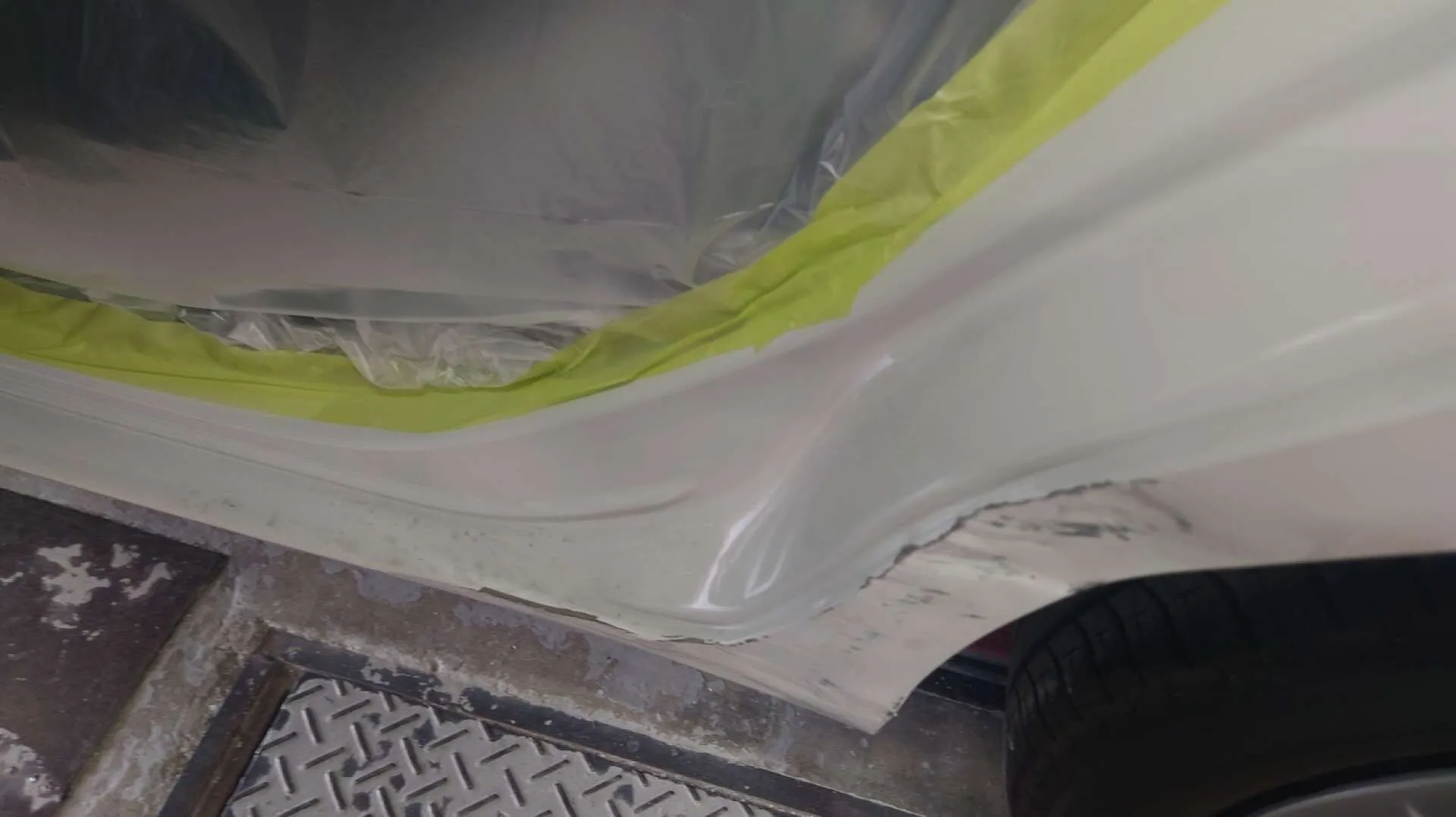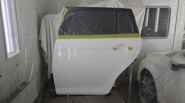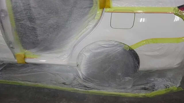 塗装ブースにてマスキング作業を行い塗装します。今回費用を抑える為ドアのモールのマスキング処理(外すと再使用が不可な為)とプレスラインでの塗装の区切りを行い塗装範囲を小さく抑えました。通常ですと部品はすべて外し塗装も区切りの所まで塗装する作業となります。このお車は淡色の白色ですがクリヤーコートされているお車ですのでもちろん同様にクリヤーコートして仕上げます。