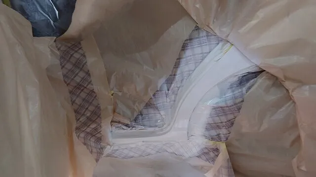 板金時に室内にホコリが入らない様に画像のようにしっかりとビニールでマスキングし作業しています。