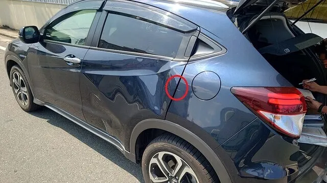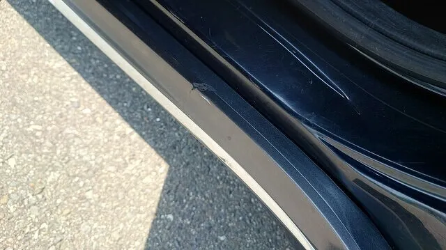 パッと見た感じではリヤドアが大きくへこんでいるだけかなと思うのですがよく見てみると赤丸部分のリヤフェンダーに引きずったような傷が入っています。あとリヤドア下部のサイドスポイラーにも傷が入っています。相手がバイクなので変則的な傷の入り方になりますね。今回リヤフェンダーは修理しますがサイドスポイラーは予算の都合上修理せずそのまま置いておくことになりました。樹脂部品ですので錆びることはありませんのでご安心くださいませ。