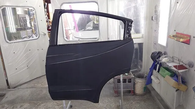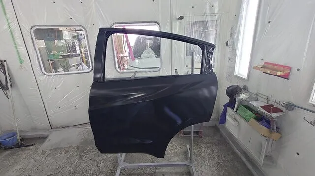 リヤドアは損傷がひどいため交換なのですがリサイクルパーツを探しましたがお値打ちな商品が無く新品のドアの交換となりました。通常新品にて供給されるドアは1枚目の錆止め程度の塗装しかされておらず紫外線に非常に弱い状態です。このまま車体色の色を塗装し仕上げると後々塗装の剥がれや艶引きなどのトラブルになる可能性があります。それを防ぐため当店では2枚目のようなサフェーサーを塗布し紫外線によるダメージをできるだけ抑える方法で作業しております。仕上がり直後はわかりませんが前記の通り後々のことを考え見えない部分にも手をかけてお客様の大事なお車を扱わせて頂いております。このあと3枚目の車体色に塗装しました。