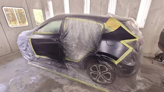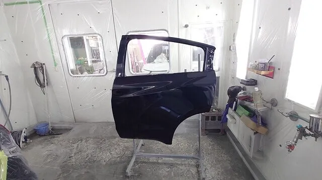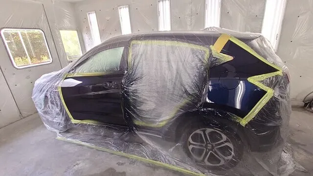 塗装ブースにてヴェゼルのお車の塗装を行います。今回最小限での修理ですのでリヤバンパー、テールランプは外さずマスキング処理で行っております。フロントドアのドアハンドルは美観のため外しました。この辺りもお客様と打ち合わせを行いどういう方法で修理するかを細かく決めていきます。塗装の方はリヤフェンダーは傷がありもちろん塗装なのですが色の加減上フロントドアもグラデーション塗装を行う必要があります。大きく塗り広げていき自然な具合にぼかす事ができました。
