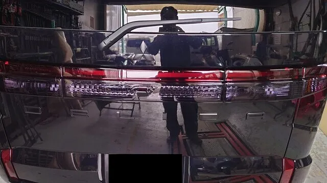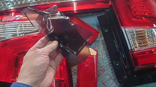 施工するデリカD5のテールランプを外し元々付いていたカバーをはがします。今回バンパー内のリフレクターも一緒に施工するので外しました。