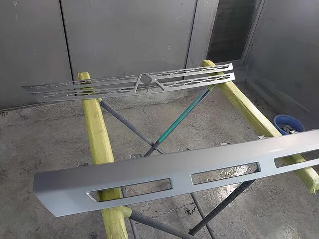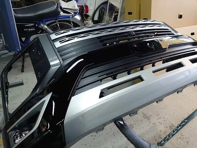 この後画像にはございませんがボディと同色(アイガーグレーメタリック)に塗装し仕上げました。このグリルは先ほどのハニカム状の為塗装が奥までかかりにくく何回も塗装しかかっているかどうかチェックを行い細かな奥部分までキッチリと仕上げました。