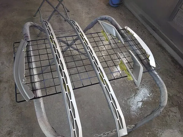 塗装するフロントグリル、アイライン、アンダーカバー、フォグベゼルを下地処理します。細かなハニカム状の箇所も丁寧に足付け処理し脱脂後密着剤にて処理をしました。